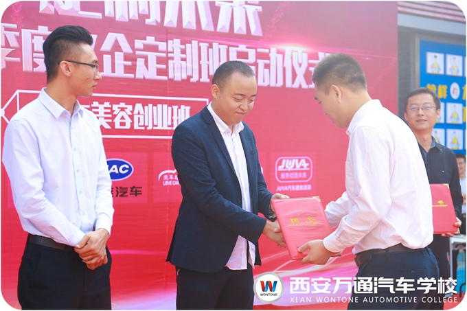 其中,西安萬通汽車學校校區(qū)主任、創(chuàng)就業(yè)中心主任以及陜西奧特森江淮4S店尚勇總經理、靚車牛人汽車美容服務連鎖龍科宇總監(jiān)等領導出席本次啟動儀式。