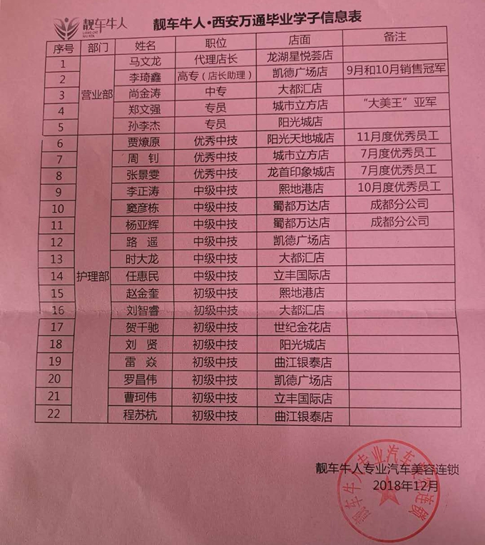 (靚車牛人汽車美容服務連鎖里的萬通就業學子花名冊)