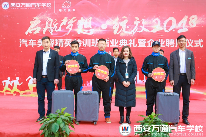 時值12月25日圣誕節,西安萬通汽車學校汽車美容精英特訓班結業典禮暨受聘儀式在隆重舉行,西安萬通教務處李剛主任、創就業指導中心魏剛主任、每天美車汽車服務連鎖人事總監王楠楠女士、每天美車汽車服務連鎖培訓部主管李小龍先生、西安萬通梁奇主管、張見兵主管、美容精英特訓班的24名學子等參會。