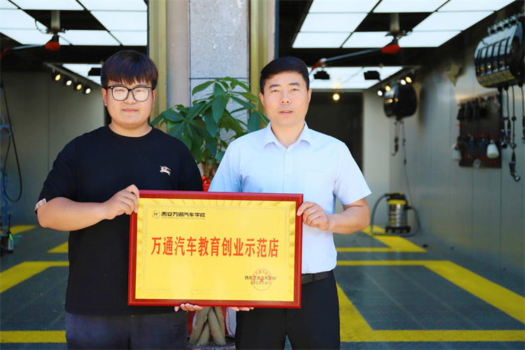 郭主管和張軍利老師代表學校向毛小強的曼尼諾汽車連鎖服務中心頒發了“萬通汽車教育示范店”,這是學校對于學生的認可和鼓勵,也期待學生更好的發展。