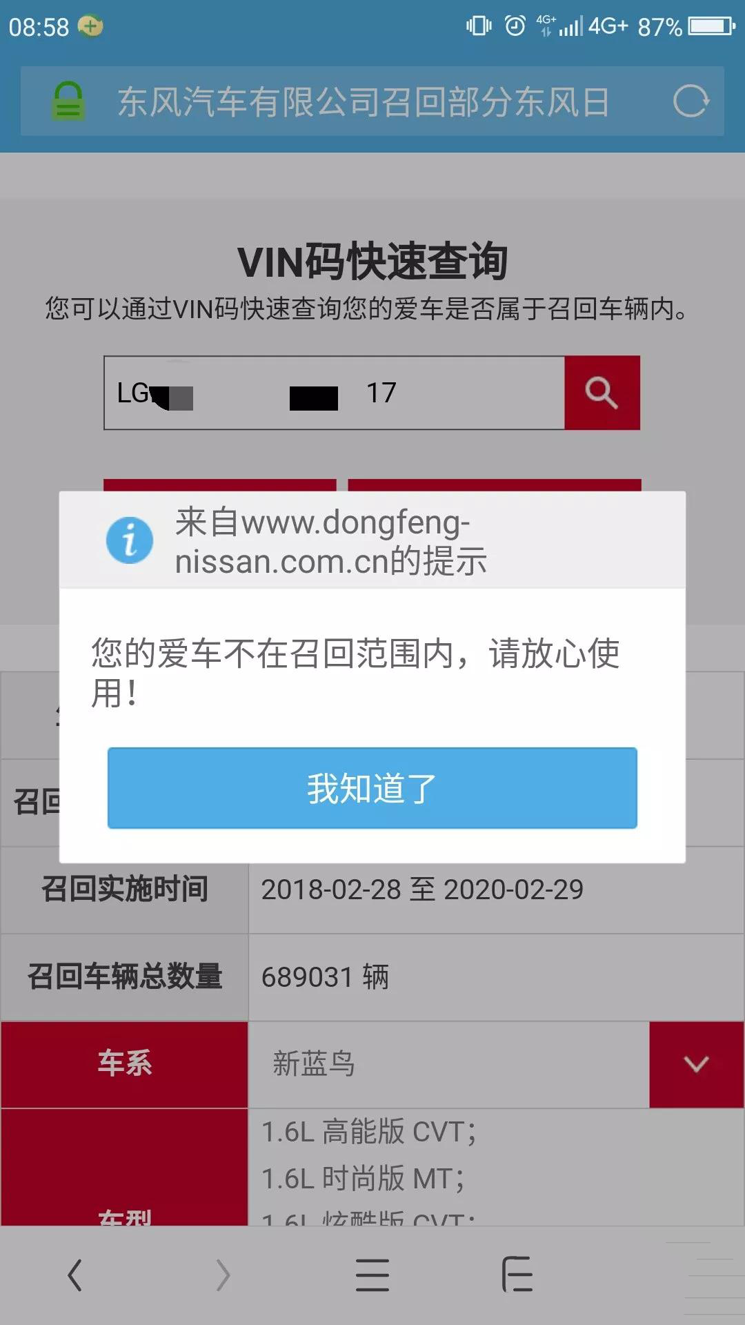 召回原因:本次召回范圍內部分車輛制動總泵油封由于表面潤滑不足,可能存在翻轉現象,造成密封不良,產生漏油并引起組合儀表的制動警告燈點亮提示。極端情況下,在警告燈點亮后繼續使用,制動液泄漏嚴重導致制動力不足。我趕緊輸入了我的車架號,進行查詢,查到了這樣的信息。