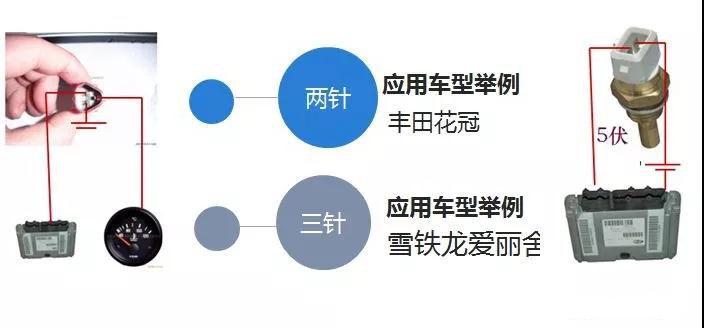 它分為兩線式和三(四)線式。兩線式水溫傳感器它把數(shù)據(jù)傳遞給電腦,電腦分析數(shù)據(jù)的大小,水溫過低、過高都會讓報(bào)警燈點(diǎn)亮,綠低紅高;三(四)線式水溫傳感器其中兩根線,是把數(shù)據(jù)傳給電腦的,另外兩根線把水溫?cái)?shù)據(jù)傳給水溫表,實(shí)時線式當(dāng)前的水溫。三線式共用搭鐵線、四線式搭鐵線也是分開的。