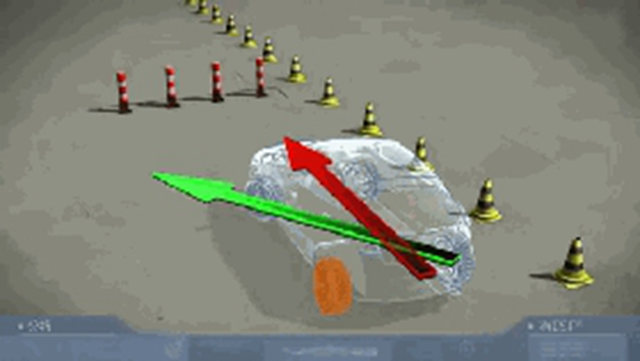 ESP能夠根據方向盤旋轉的角度、車身角度和車速,而對不同的車輪施加不同的制動力,來保證車輛高速行駛的動態穩定性。圖中白車沒有esp,紅車就有esp。