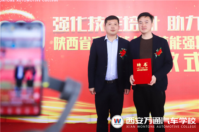 陜西卡爾名車維修服務(wù)連鎖公司負責人受聘,與校長助理合影
