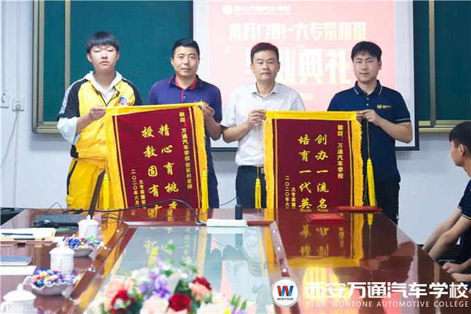 接著學生代表楊春暉同學也表達了對學校、老師的感謝之情。他感謝了西安萬通這些年來的栽培,因為在西安萬通收獲的不僅僅是技術和知識,更多的是人生道路的啟迪與指引,并莊重地向學校承諾,將永遠牢記“明德精技,知行合一”的校訓,在各自的崗位上繼續發揚開拓、創新、務實、奉獻的優良傳統。隨后,兩位學生代表向母校和恩師獻上錦旗,表達感激之情。