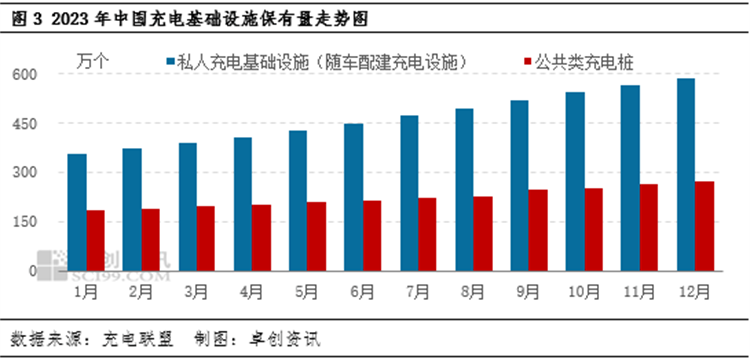 2023年,隨車配建充電設(shè)施及公共充電樁、換電站數(shù)量均出現(xiàn)明顯上漲。充電聯(lián)盟數(shù)據(jù)顯示,2023年1-12月,中國充電基礎(chǔ)設(shè)施增量為338.6萬臺,同比上漲30.6%;其中公共充電樁增量為92.9萬臺,同比上漲42.7%;隨車配建私人充電樁增量為245.8萬臺,同比上漲26.6%;換電站保有量增長至3567座。此外,針對新能源汽車在長途出行中所面臨的續(xù)航不足問題,高速服務(wù)區(qū)陸續(xù)進行充電樁建設(shè),目前具備充電服務(wù)能力的高速服務(wù)區(qū)數(shù)量已經(jīng)達到5978個,充電停車位近3萬個。 截至2023年12月,全國充電基礎(chǔ)設(shè)施累計數(shù)量為859.6萬臺,同比上漲65%;充電站保有量約為17萬座,同比上漲53%。
