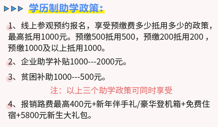 二、暖心助學,助力成長 為了讓更多有志青年能夠圓夢校園,我們特別推出了一系列暖心助學政策。無論是學費減免、獎學金獎勵,還是助學金支持,我們都將竭誠為您提供幫助。我們相信,每一個有夢想的青年都應該得到支持,每一個努力的學子都應該被看見。