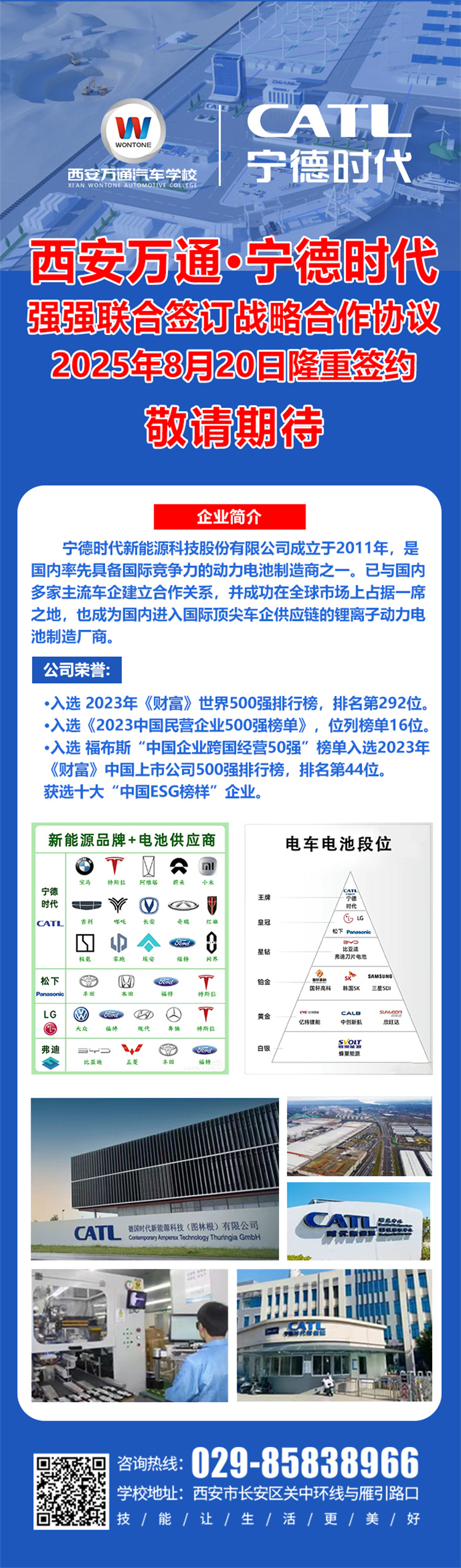 強(qiáng)強(qiáng)聯(lián)手,共筑新能源人才培養(yǎng)新高地 寧德時(shí)代作為世界五百?gòu)?qiáng)企業(yè)、中國(guó)TOP10頂尖品牌,連續(xù)多年蟬聯(lián)全球第一大動(dòng)力電池制造商,其技術(shù)實(shí)力與市場(chǎng)影響力為行業(yè)矚目。 而西安萬(wàn)通汽車學(xué)校深耕職業(yè)教育領(lǐng)域多年,以“實(shí)戰(zhàn)化教學(xué)、專業(yè)化培養(yǎng)”為核心,為社會(huì)輸送了大批汽車技術(shù)精英。